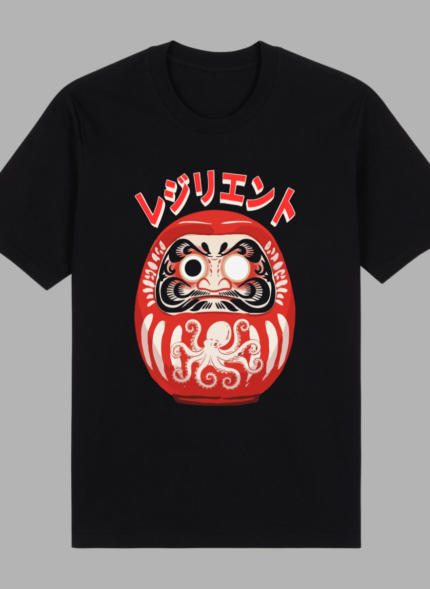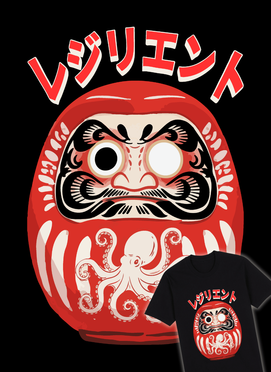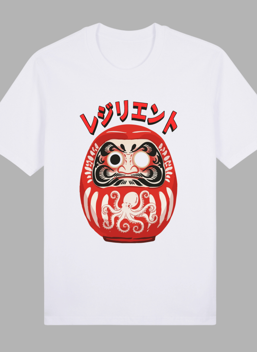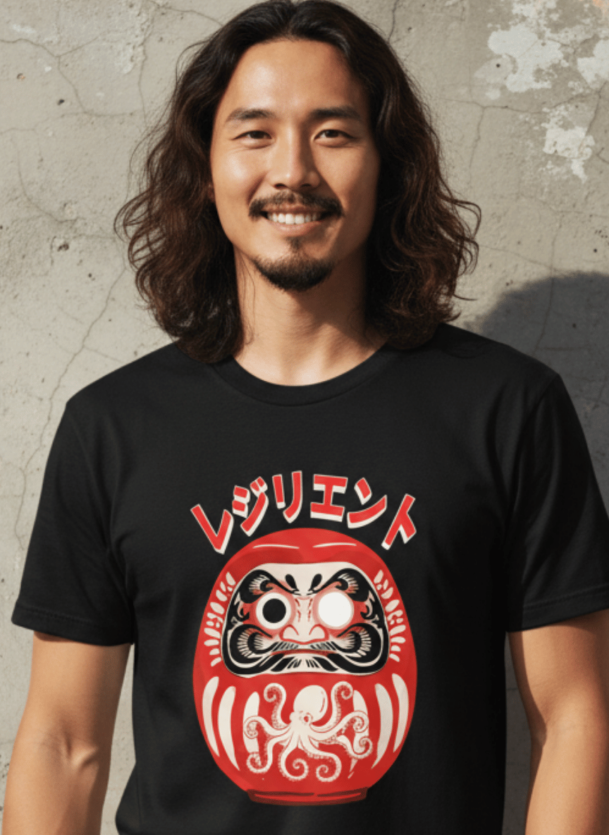 Daruma Graphic Shirt: Graphic print of a Daruma doll. The text translates to “Resilient”.